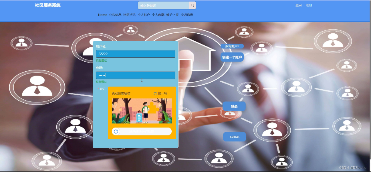 首先来访人员需要注册登录才能进入社区服务系统,通过输入账号,密码进行登录。如图5-13 5-14所示。