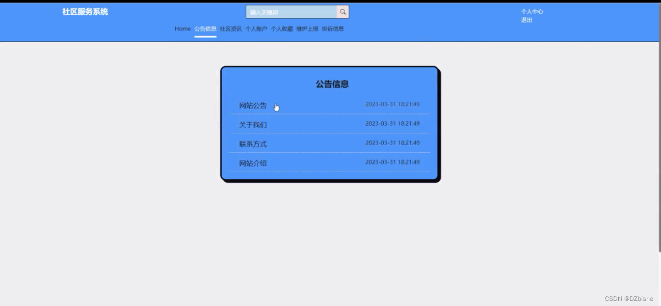 用户在点击导航栏上面的公告信息后,就可以搜索查看公告信息,用户根据自己的喜好可以进行交流,公告信息界面如下图5-10所示。