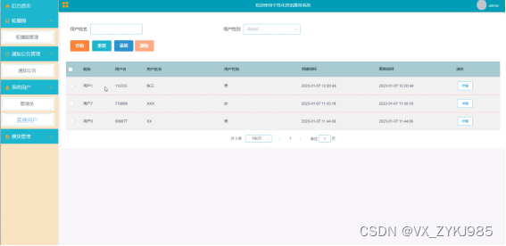 用户管理,在用户管理页面中可以对索引、昵称、用户名、用户姓名、用户性别等信息进行详情、添加或删除等详细操作,如图5-13所示。