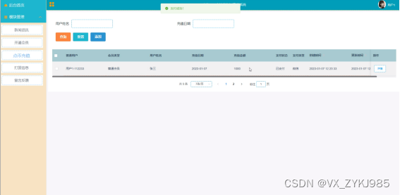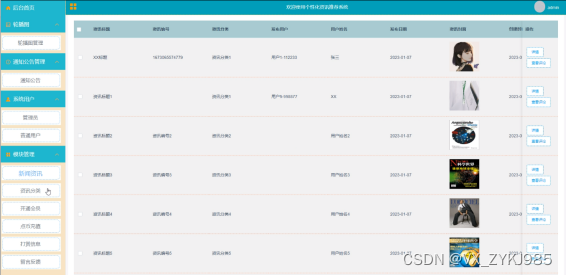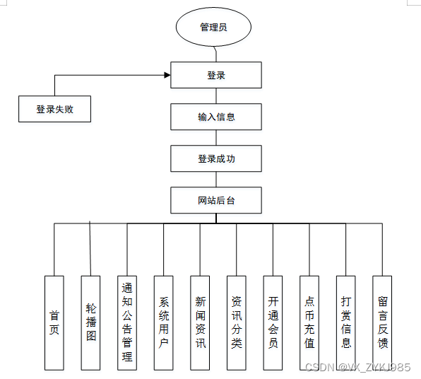 (1)功能要求:可以管理后台首页、轮播图(轮播图管理)、通知公告管理(通知公告)、系统用户(管理员、普通用户)、模块管理(新闻资讯、资讯分类、开通会员、点币充值、打赏信息、留言反馈)等功能模块。