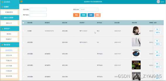 新闻资讯管理,在新闻资讯管理页面中可以对索引、资讯标题、资讯编号、资讯分类、发布用户、用户姓名、发布日期、资讯封面等信息,根据详情查看评论进行添加或删除等操作,如图5-11所示。