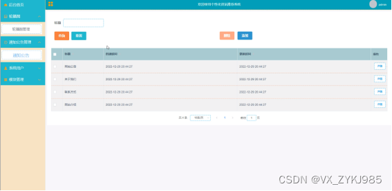 通知公告管理,在通知公告管理页面中可以对索引、标题等信息进行详情、查询、删除等详细操作,如图5-12所示。