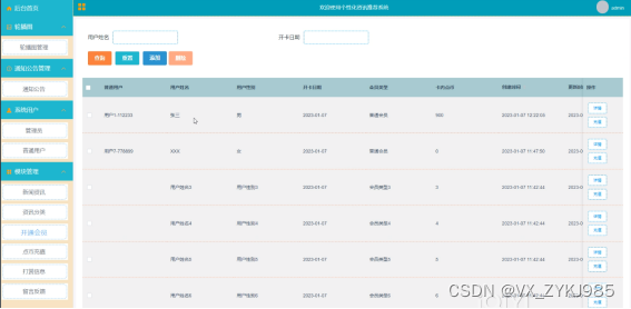 开通会员管理,在开通会员管理页面中可以对索引、普通用户、用户姓名、用户性别、开卡日期、会员类型、卡内点币、等信息进行详情、充值、添加或删除等详细操作,如图5-14所示。