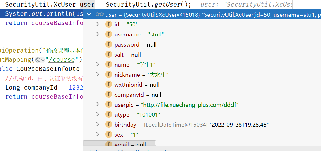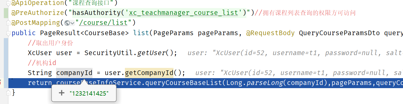 public PageResult<CourseBase> list(PageParams pageParams, @RequestBody QueryCourseParamsDto queryCourseParams){//取出用户身份XcUser user = SecurityUtil.getUser();//机构idString companyId = user.getCompanyId();return courseBaseInfoService.queryCourseBaseList(Long.parseLong(companyId),pageParams,queryCourseParams);