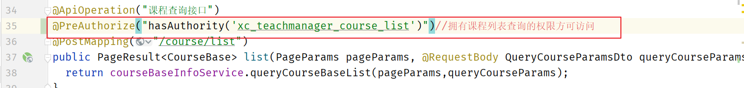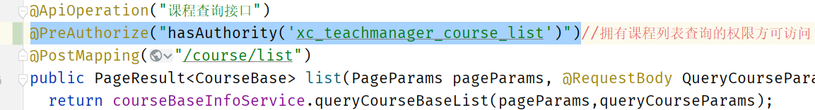 @PreAuthorize("hasAuthority('xc_teachmanager_course_list')")//拥有课程列表查询的权限方可访问