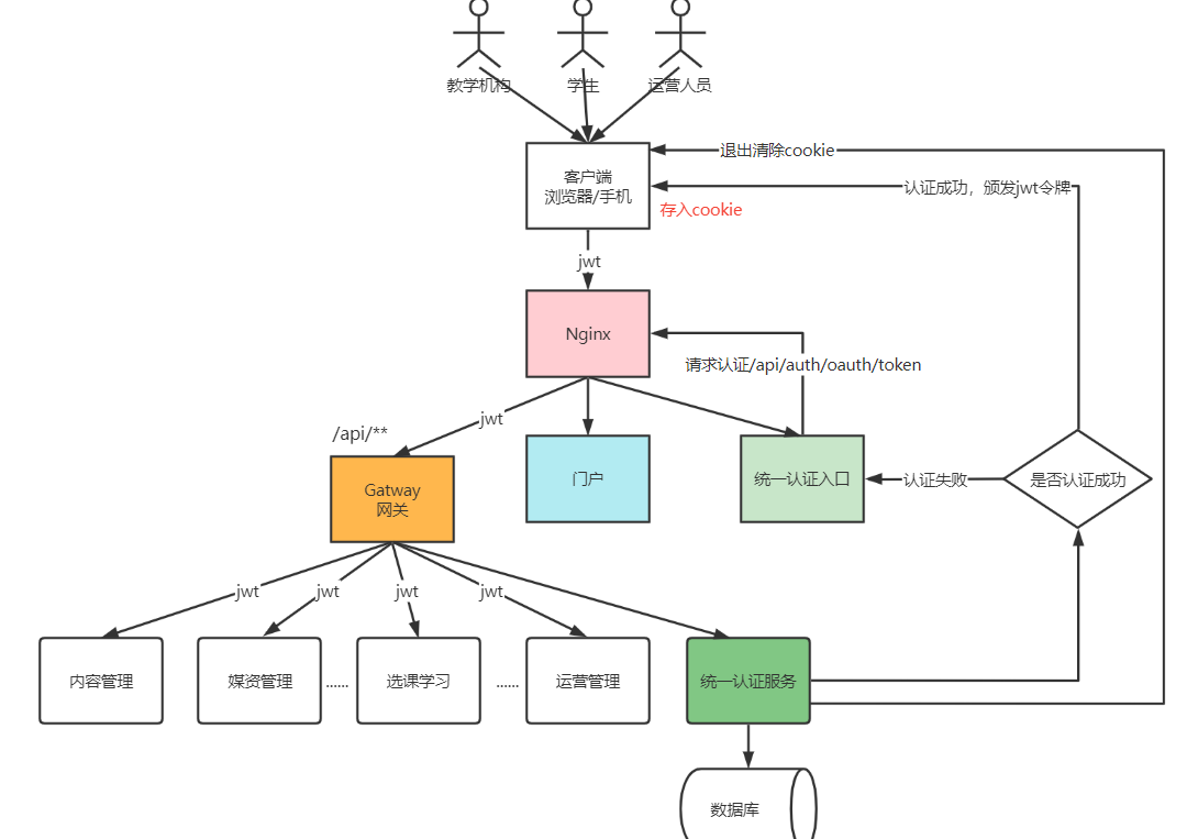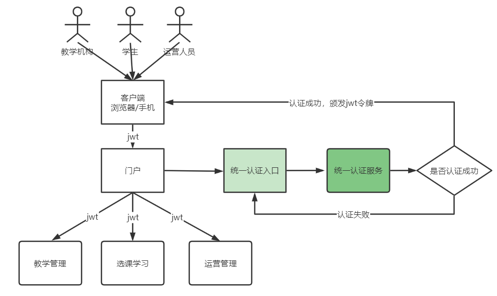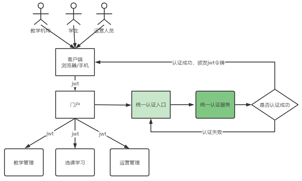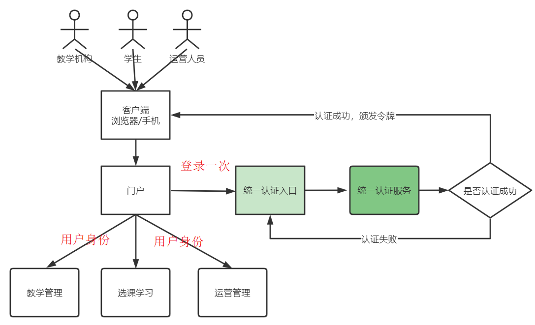 项目包括学生、学习机构的老师、平台运营人员三类用户,三类用户将使用统一的认证入口,如下图:
