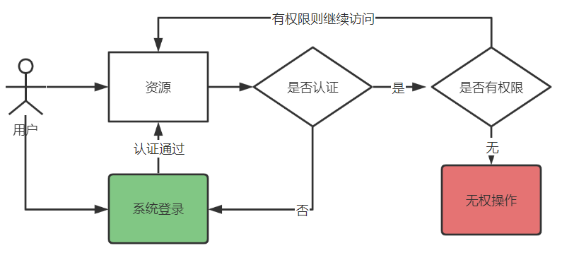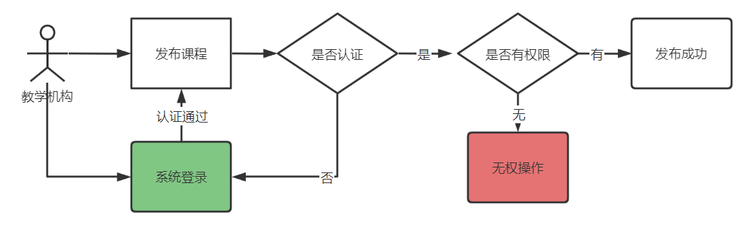 用户认证通过后去访问系统的资源,系统会判断用户是否拥有访问资源的权限,只允许访问有权限的系统资源,没有权限的资源将无法访问,这个过程叫用户授权。比如:用户去发布课程,系统首先进行用户身份认证,认证通过后继续判断用户是否有发布课程的权限,如果没有权限则拒绝继续访问系统,如果有权限则继续发布课程。如下图:
