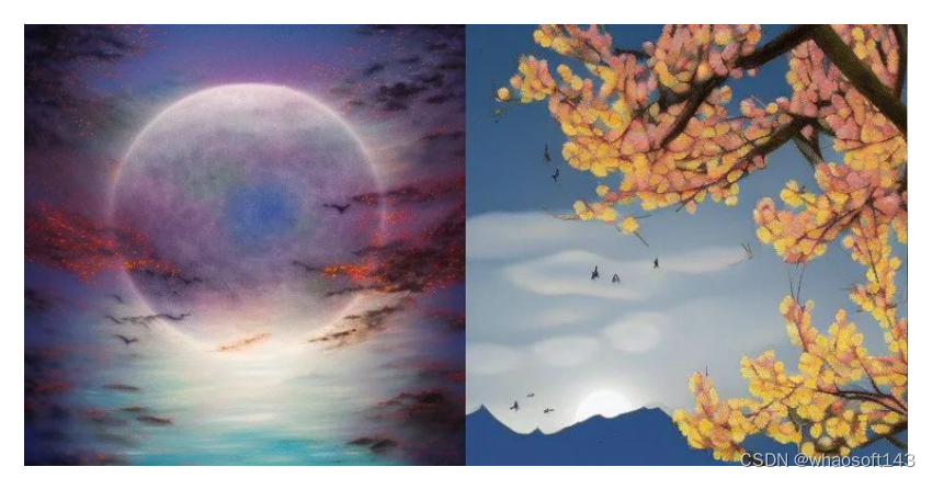 VisCPM-Paint 模型中分别输入 “海上生明月,天涯共此时,唯美风格,抽象风格”“人闲桂花落,月静春山空” 两条 prompts,生成了以下两张图片: