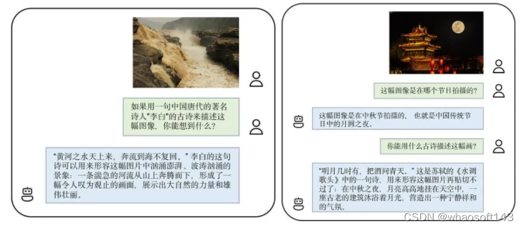 相当惊艳,可以说精准把握了古诗词的意境,以后读不懂诗句就直接生成个图片来理解!如果应用在设计上,可以节省一大笔人力。不仅能 “作画”,用上 VisCPM-Chat,还能 “吟诗”:用图片反向检索诗句。比如能用李白的诗描绘黄河的景象并作解读,在面对中秋月夜时还能用苏轼的《水调歌头》借景抒情。