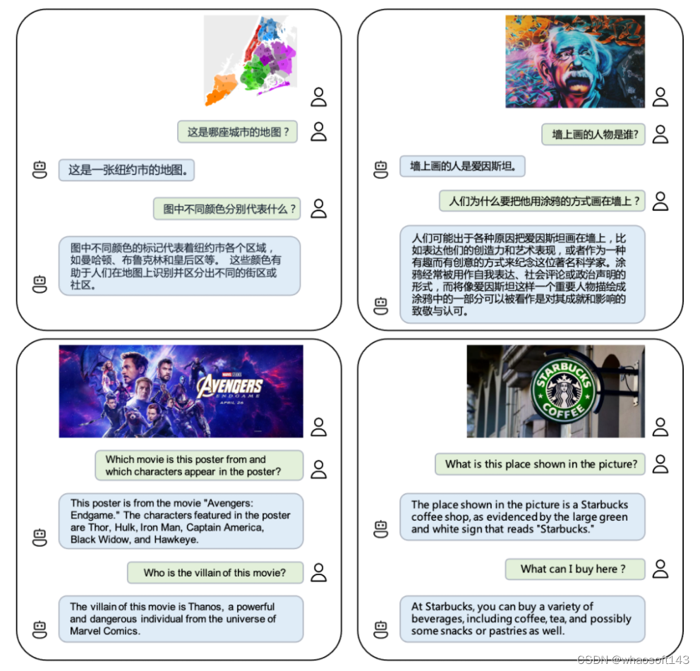 下面是 VisCPM-Chat 的多模态对话能力展示,不仅能识别具体地区的地图,还能读懂涂鸦画和电影海报,甚至认识星巴克的 logo。而且,中英文双语都很溜!
