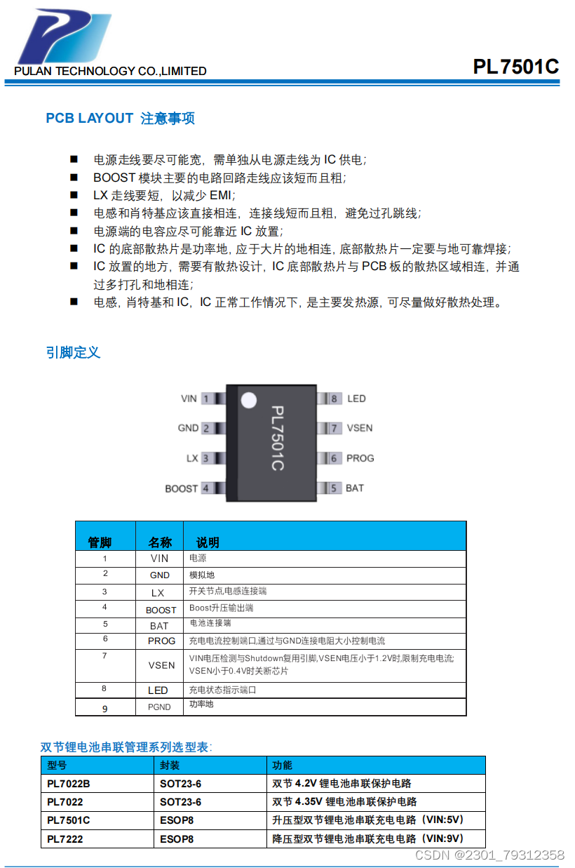 PL7501C 是一款 3.6V-5.5V 输入,1A 输出,双节锂电池/锂离子电池充电的异步升压