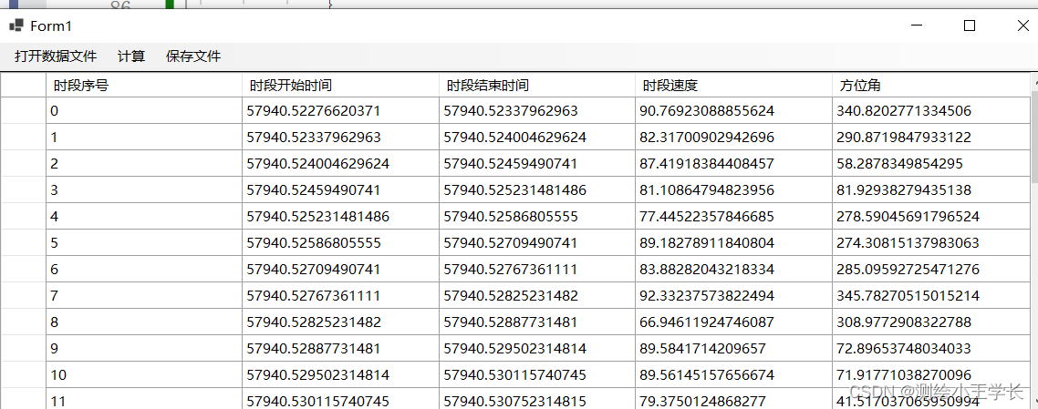 private void 打开数据文件ToolStripMenuItem_Click(object sender, EventArgs e){try{OpenFileDialog opf = new OpenFileDialog();opf.Filter = "文本文件|*.txt";opf.Title = "请选择你要导入的文件";if (opf.ShowDialog() == DialogResult.OK){StreamReader sr = new StreamReader(opf.FileName);//设置分割符号读取文件string[] line = sr.ReadLine().Trim().Split(',', ',');data = new DataCenter();Epoch epoch = new Epoch();data.epochs = new List();//循环读取知道为空while (!sr.EndOfStream){epoch = new Epoch();line = sr.ReadLine().Trim().Split(',', ',');epoch.ID = line[0];epoch.status = int.Parse(line[1]);epoch.Btime = long.Parse(line[2]);epoch.x = double.Parse(line[3]);epoch.y = double.Parse(line[4]);epoch.year = (int)(epoch.Btime / 1e+10);epoch.month = (int)(epoch.Btime / (1e+8) % 100);epoch.day = (int)(epoch.Btime / 1000 / 1000 % 100);epoch.hour = (int)(epoch.Btime / 10000 % 100);epoch.minute = (int)(epoch.Btime / 100 % 100);epoch.second = (int)(epoch.Btime % 100); data.epochs.Add(epoch);};}}catch (Exception){MessageBox.Show("读取文件有误");throw;}}private void 计算ToolStripMenuItem_Click(object sender, EventArgs e){Algo algo = new Algo();for (int i = 0; i < data.epochs.Count; i++){algo.Mjd(data.epochs[i]);}//循环解算for (int i = 0; i < data.epochs.Count-1; i++){int j = i + 1;data.epochs[i].length= algo.GetLong(data.epochs[i], data.epochs[j]);data.epochs[i].angle=algo.GetAngle(data.epochs[i], data.epochs[j]);data.epochs[i].Vsu=algo.GetVsu(data.epochs[i ], data.epochs[j]);}//输出dataGridView1.RowCount = data.epochs.Count; for (int i=0; i < data.epochs.Count-1; i++){dataGridView1.Rows[i ].Cells[0].Value = i;dataGridView1.Rows[i ].Cells[1].Value = data.epochs[i].mjd;dataGridView1.Rows[i ].Cells[2].Value = data.epochs[i+1].mjd;dataGridView1.Rows[i ].Cells[3].Value = data.epochs[i].Vsu;dataGridView1.Rows[i ].Cells[4].Value = data.epochs[i].angle;}}