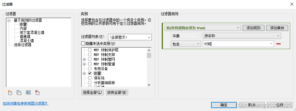 rules.Add(ParameterFilterRuleFactory.CreateContainsRule(elementId, "衬砌",true));//true,是否区分大小写