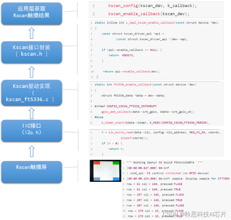 CSK6 SDK提供了Kscan的sample,在这个Kscan例程中,主程序对触摸屏初始化,注册触摸事件的回调,通过回调结果获取触摸点的坐标并输出日志。