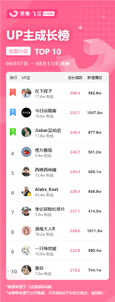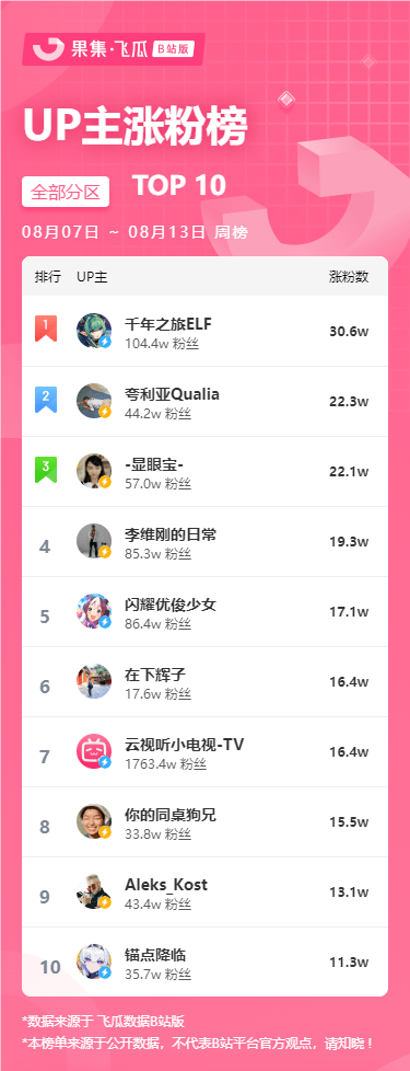 8月第2周榜单丨飞瓜数据哔哩哔哩B站UP主排行榜发布!