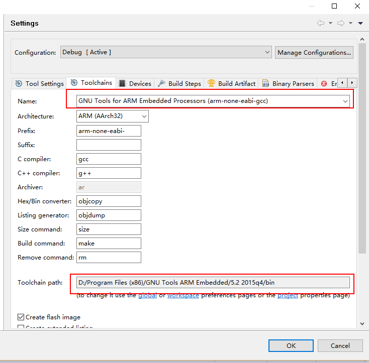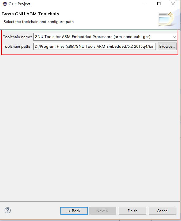 选择编译链,由于我们安装的是GNU ARM的工具链,所以选择对应的,然后指定工具链的路径。