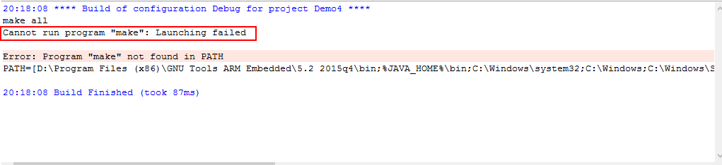 然而立马就出现下面的问题,找不到make文件,通过查资料我们可以知道GNU Toolchain中是不自带make工具的,但是make工具其实都是一样的,所以我们能否使用Eclipse自带的make工具呢?
