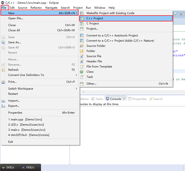 打开eclipse,选择工作目录,点击File->New->C++ project