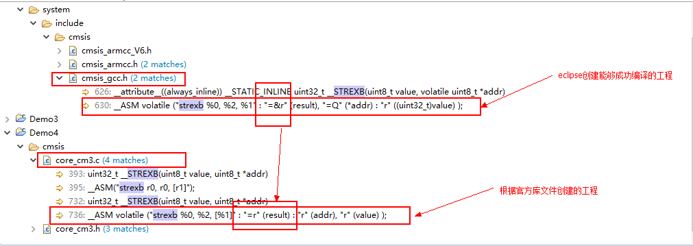 既然这条汇编指令的格式是由编译器决定的,那么我们怎么知道这条指令正确的格式呢?还记得之前创建工程时有现成的工程模版吗?我们可以创建一个现成的工程模版,然后编译发现这个现成的模版编译是没有问题。然后对比两个工程中的这条指令格式,我们发现了一个惊人的差异,如下图:
