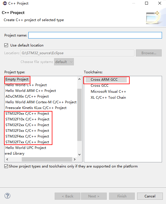 然后我们会发现下图的界面,在这个界面中有STM32等工程的现成选项,右侧还有该工程支持的编译链,如Cross Arm gcc,根据这个我们就可以判断前面的软件安装成功了。此时我们可以直接点击新建一个基于STM32模版的工程,也可以创建一个空的工程,然后自己配置工程结构,就像我们使用MDK一样。此处我们以创建空工程为例子。