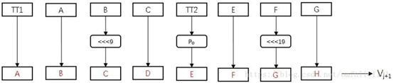 更新ABCDEFGH:在计算的TT1,TT2中间之后,依次更新各个寄存器如下: