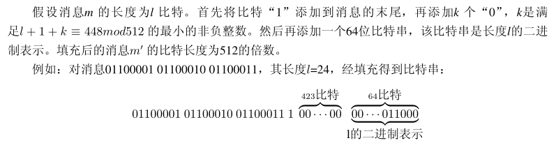 假设消息m 的长度为l比特,将l分组--将需要加密的文件转为2进制,然后分组为512*K+448(K 是满足l + 1 + K ≡ 448mod512 的最小的非负整数,不够用一个“1”和多个“0”补齐),再加上64位的文件长度信息构成512*(K+1)的分组。填充后的消息m′ 的比特长度为512的倍数。