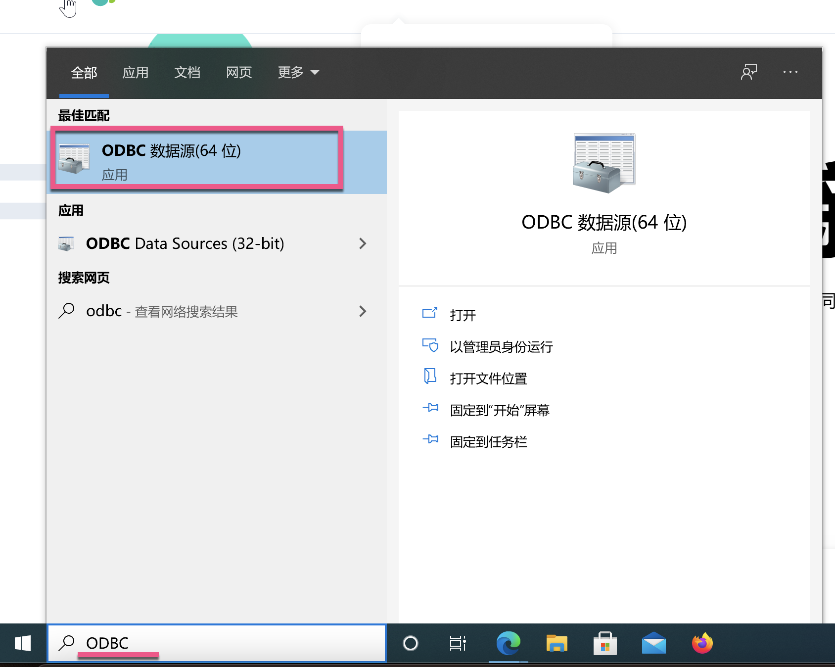 我们搜索 ODBC,并点击 “ODBC 数据源(64位)”: