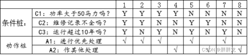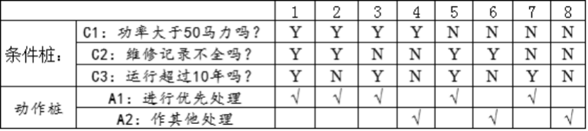 【判断表法】问题描述: “……对于功率大于50马力的机器,并且维修记录不全或已运行10年以上的机器,应给予优先的维修处理……”