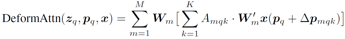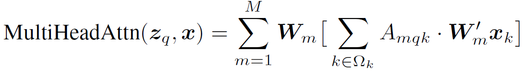 给定一个feature map ,q,m,k分别是query,attention head,sampled key的下标。K是是采样的key的数量,K远小于HW。原始multi-head attention feature的计算方式为: