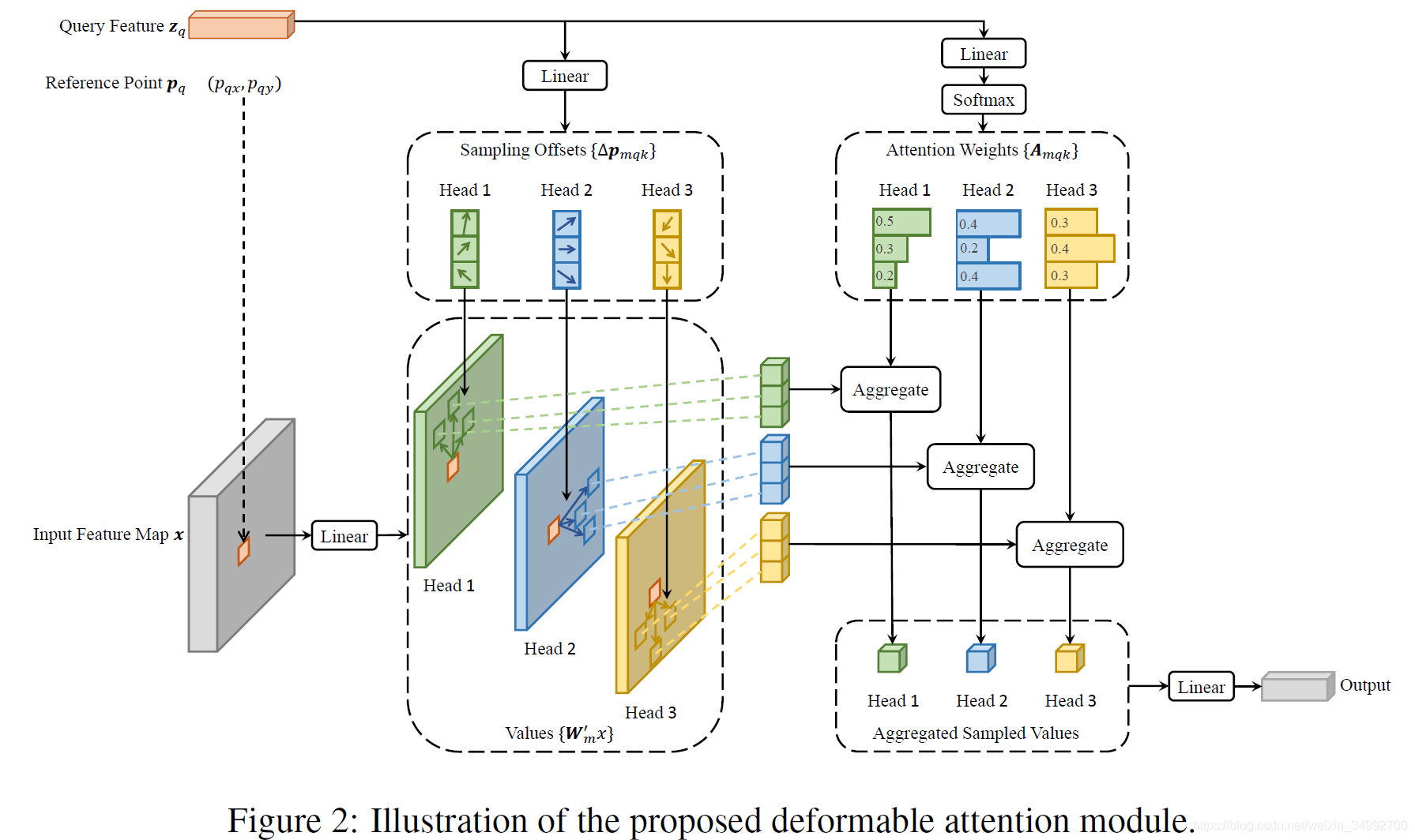 经过一个输出通道数为3MK的线性映射操作获得的。输出的前2MK是偏移量的坐标,后MK经过softmax后得到attention weight。