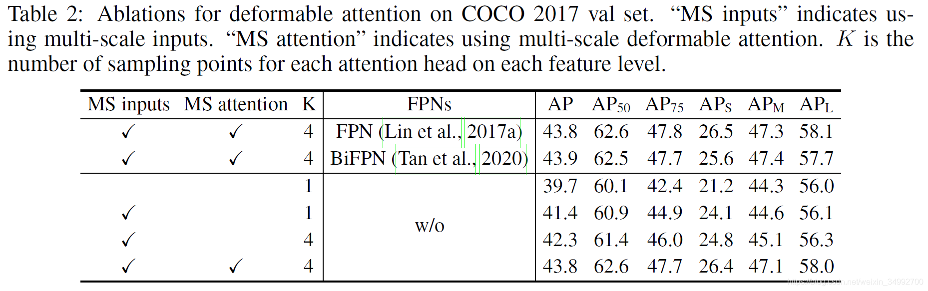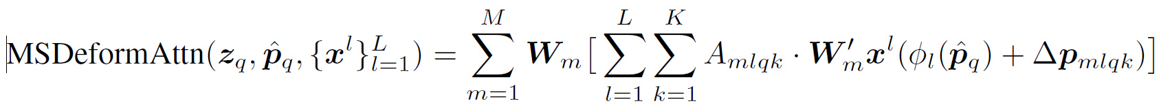 ,则 multi-scale deformable attention feature的计算方式如下式。它与上述deformable attention feature的不同之处就在于它是从multi-scale feature中采样了LK个点。