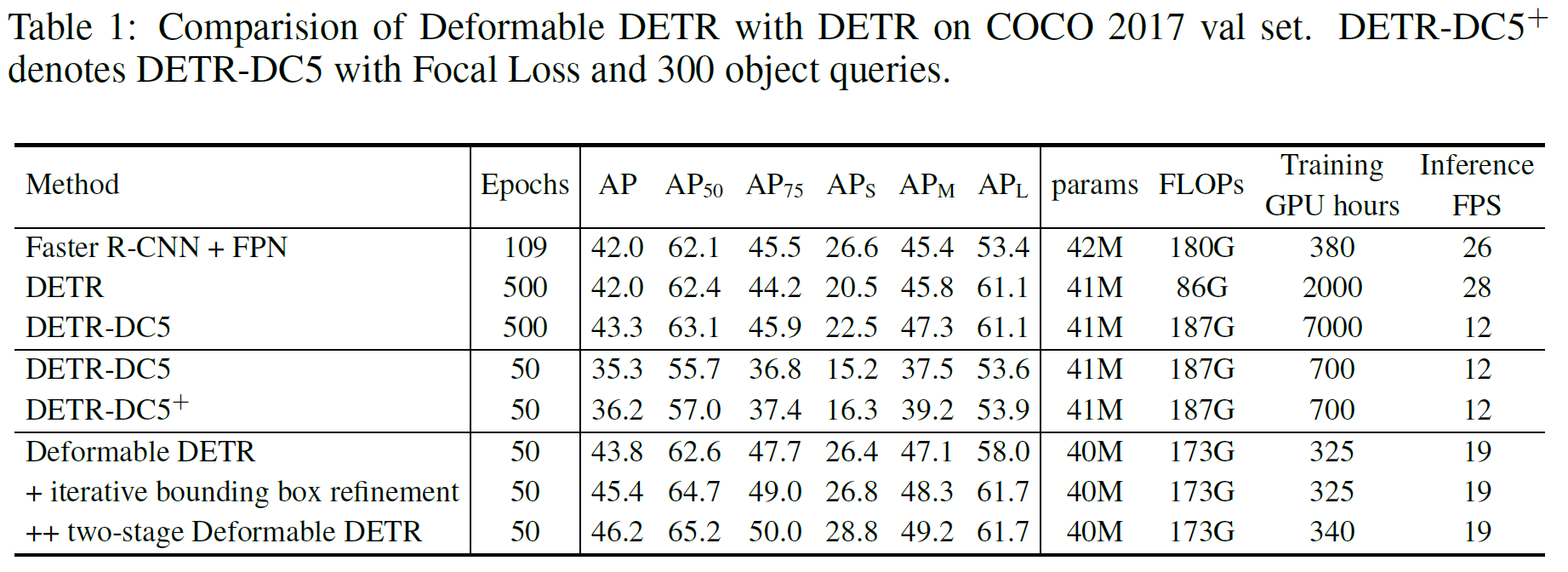 1)收敛慢,比如在COCO上收敛需要500 epoch,比Faster RCNN慢了10到20倍;attention module在初始化时对每个pixel的attention weight是均匀分布的,因此需要较长时间使它学习去关注有意义的位置。