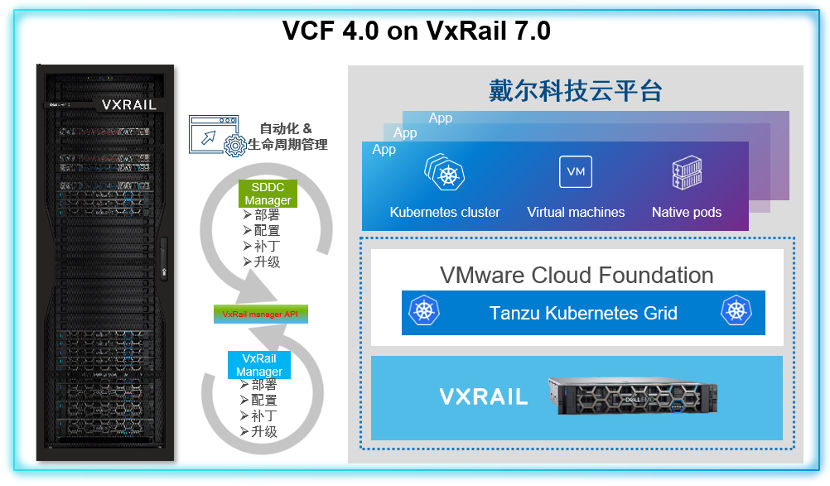 以2020年最新推出的VCF 4.0 on VxRail 7.0为例,它之所以被称之为混合云的操作中心,就是因为它深度集成了VMware SDDC 和 VxRail的产品,不仅包含了VxRail Manager 7.0、vSphere 7.0、vSAN 7.0、NSX-T 3.0等软件,也深度集成了SDDC Manager 4.0、vRealize Suite Lifecycle Manager 8.1、vRealize Automation 8.1等软件定义数据中心的套件,既能够以单一管理界面(vCenter)实现对软硬件的共同管理,也支持云原生的开发能力。可以说,作为与VMware平台共同开发,且作为VMware唯一认证的HCI平台,VxRail是VMware中重要的组成部分。