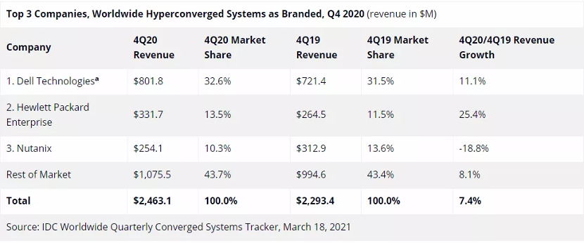 根据IDC全球融合系统季度追踪报告显示,2020年第四季度全球融合系统市场收入增长至45亿美元,其中超融合系统收入25亿美元,已占融合系统市场总收入的“半壁江山”。另一份报告中也显示,在接受调查的的全球企业中,超过72%的企业已经部署或计划部署超融合,此外在采用混合云的企业中,超融合的采用数量更是猛增至三分之二,这从另一个侧面也表明了超融合已成为混合云架构中的重要选择。