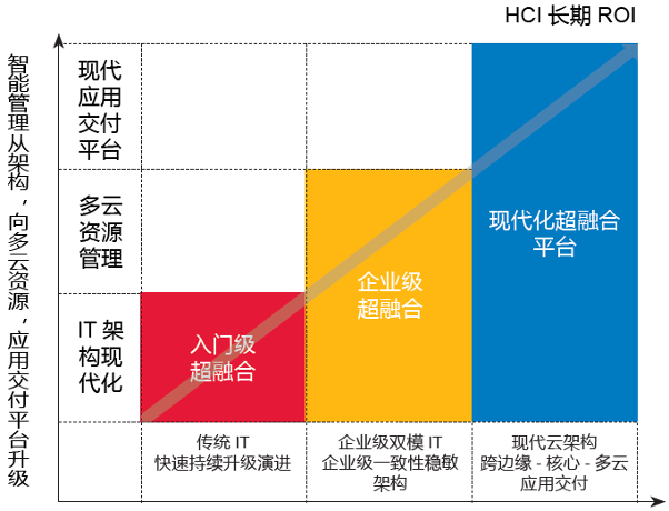 也正因此,要同时实现企业关键业务“稳态”和“敏态”的融合,超融合架构就要从最初的以迅捷部署、简化管理和提升IT对业务的响应速度为主要目标,向跨架构层、多云资源层和应用开发层的、具有企业级一致性的现代化超融合平台升级。