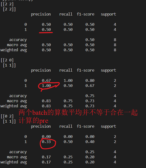 如果你是批处理的话,对每个批次分别进行计算Accuracy,F1score, Recall, Precision的话,就要对各个批次的结果进行平均,这会导致: