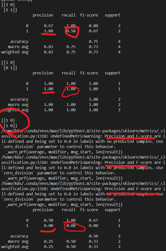 print(metrics.classification_report(y_true, y_pred))y_pred = [0, 0]#这种情况对于类别1没法计算precision