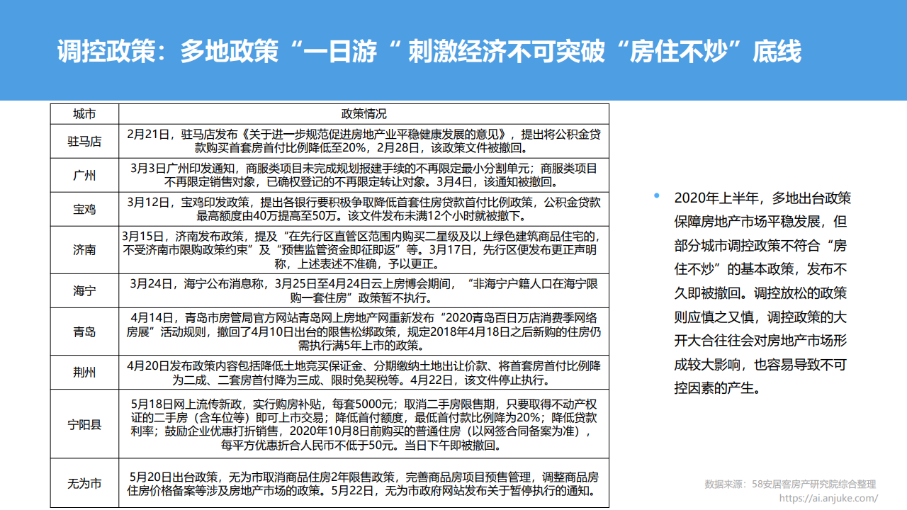 针对2020年上半年行业变化,6月30日,58同城、安居客发布《2020年上半年楼市总结》报告。报告指出,在因城施策的条件下,多地出台政策保障房地产市场平稳发展。虽然部分城市在土地政策上给予一定放松,提升了房企拿地意愿,但总体来看, “房住不炒”依然是楼市调控的主要基调。