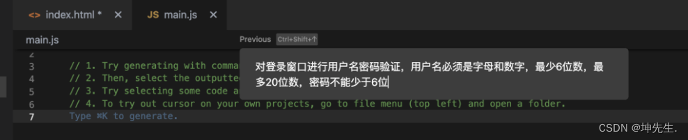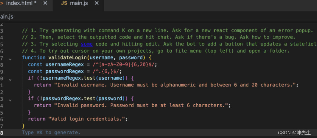 然后我们再创建一个 main.js 文件,让编辑器写一些对用户输入的验证: