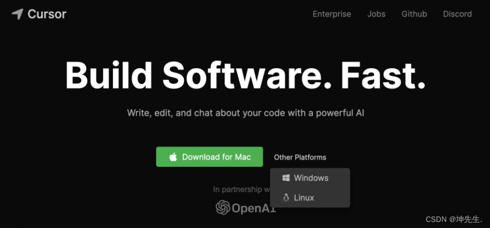 我们可以直接在 Cursor 官网 Cursor | Build Fast 下载该编辑器,支持三个平台:Windows、Mac、Linux。