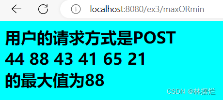 public class Example9 extends HttpServlet {public void init(ServletConfig config) throws ServletException{super.init(config);}public void doPost(HttpServletRequest request,HttpServletResponse response) throws ServletException, IOException {request.setCharacterEncoding("utf-8");response.setContentType("text/html;charset=utf-8");PrintWriter out =response.getWriter();out.println("");String s =request.getParameter("number");String []a = s.split("[,,]+"); //输入的数据是字符串,以split方法进行字符串分隔int[] b=Arrays.stream(a).mapToInt(Integer::parseInt).toArray(); //字符串a需要转换成int类再进行最大值(最小值)的查找int i;int max=b[0];for(i=0;imax) {max=b[i];}}out.print("用户的请求方式是"+request.getMethod()+"