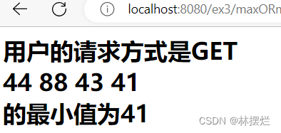 ");}public void doGet(HttpServletRequest request,HttpServletResponse response) throws ServletException, IOException {request.setCharacterEncoding("utf-8");response.setContentType("text/html;charset=utf-8");PrintWriter out =response.getWriter();String s =request.getParameter("number");String []a = s.split("[,,]+");int[] b=Arrays.stream(a).mapToInt(Integer::parseInt).toArray(); int i;int min=b[0];for(i=0;i用户的请求方式是"+request.getMethod()+"