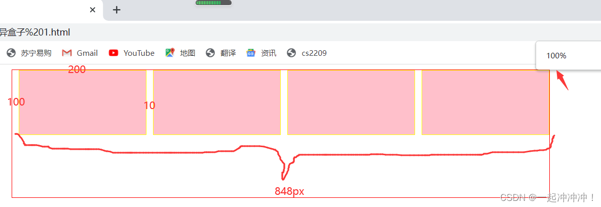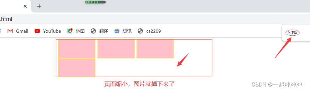 假设我们缩放百分之50%,所有的内容都缩放百分之50%,小盒子宽度为100,高度为50,边距为5,总宽度400+20+8边框px=428 ,而大盒子缩放50%只有424空间,内容超出大盒子,图片就会掉下去。