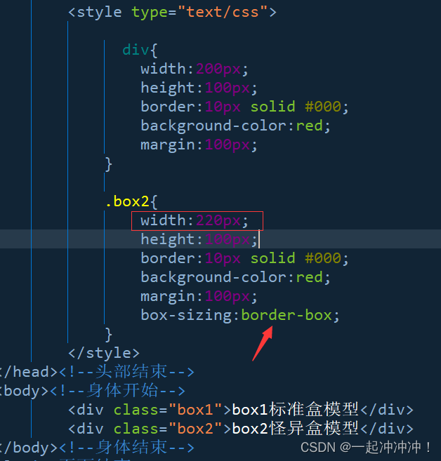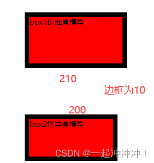 设置怪异盒子加上边框1px等于200,相当于box2内容198,总宽度等于200,所以我们只需要给内容加2px,所以div直接设置为202px即可;