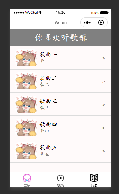 一开始计时动画进入主页,可以播放音乐,第二页可以播放视频