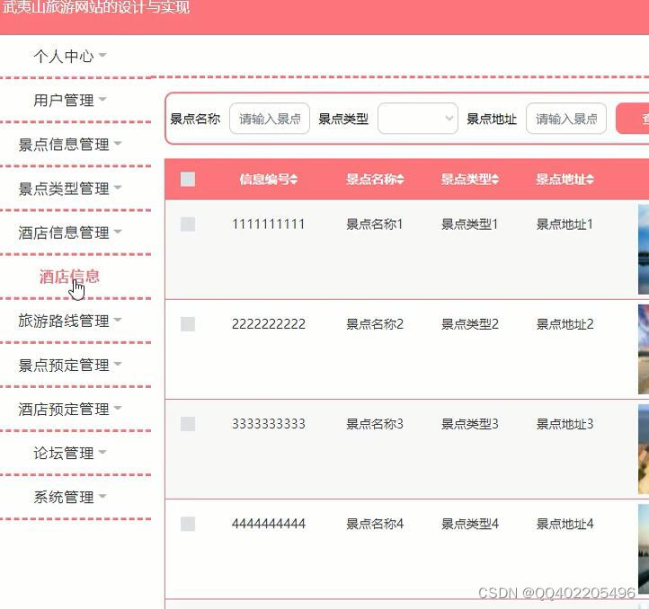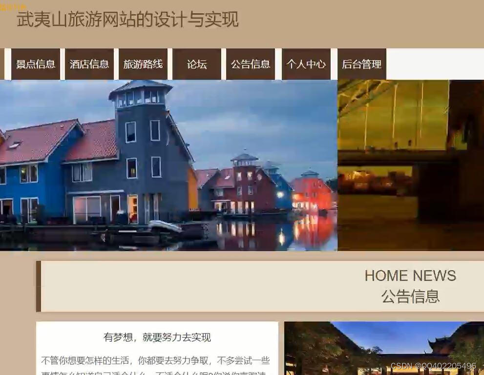 在经济快速发展的带动下,旅游业的发展也是越来越快速。人们对旅游信息的获取需求很大。在互联网飞速发展的今天,制作一个旅游网站是非常必要的。本网站是借鉴其他人的开发基础上,用MySQL数据库和JSP定制了武夷山旅游网站。系统前台实现了用户注册、登录、旅游路线、论坛、公告信息等功能,并提供了景点信息介绍和酒店信息介绍。系统的后台实现了用户、景点信息、酒店信息、旅游路线、景点预定、酒店预定等功能添加、删除和修改。