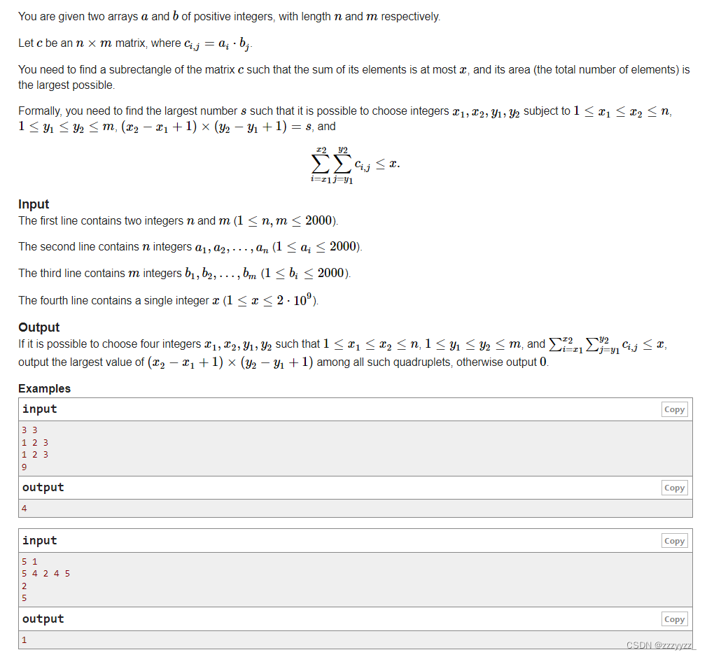 思路:因为题目中说明了ai*bj=cij,我们能够想到c中任意一个矩形都等于a中连续的一段跟b中连续一段的乘积,所以并且矩阵的行数为连续a的长度,列数为连续b的长度,所以我们可以考虑枚举矩阵的边长,这样我们只需要找到在a中长度是i的和最小的序列,跟在b中长度是j的和最小的序列,那么矩阵的和为这两个数的乘积,而且我们能够前缀和,以及预处理,处理出a与b中任意长度的连续的最小的和,然后再暴力枚举所有的边长即可,时间复杂度是O(n^2)