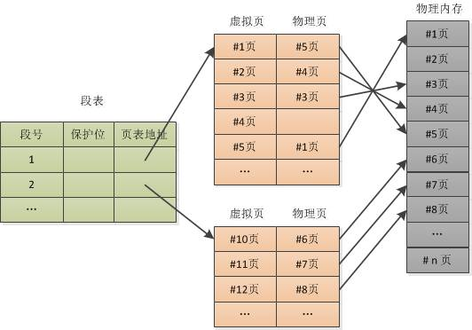 一个虚拟的内存地址来了以后,首先根据地址中的段号先找到相应的段描述表, 其中有页表的地址, 然后再从页表中找到物理内存, 过程类似这样: