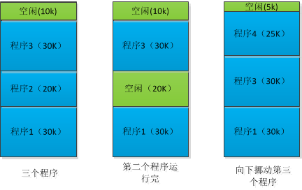 (3) 第4个程序需要25k, 没办法只好把第三个程序往下移动, 腾出空间让第四个程序来使用了。